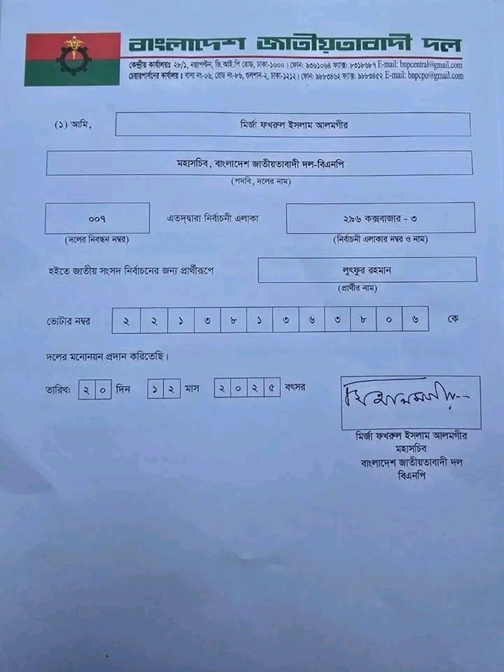 আসন্ন জাতীয় সংসদ নির্বাচনে কক্সবাজার-৩ (সদর–রামু–ঈদগাহ) আসনের জন্য বিএনপির প্রার্থী হিসেবে মনোনয়নপত্র সংগ্রহ করেছেন লুৎফুর রহমান কাজল।