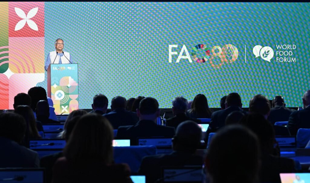 প্রফেসর ইউনুস তাঁর বক্তব্যের শুরুতে এফএও মহাপরিচালক ড. কিউ ডংইউকে ধন্যবাদ জানিয়ে বলেন, “এফএও’র ৮০ বছর শুধু উদযাপনের সময় নয়, এটি ভবিষ্যতের জন্য প্রস্তুতিরও আহ্বান।”