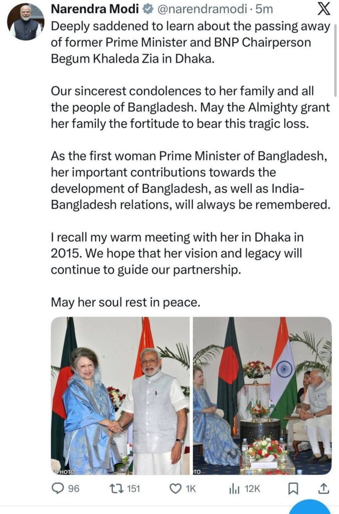 বিএনপি চেয়ারপার্সন ও সাবেক প্রধানমন্ত্রী বেগম খালেদা জিয়ার মৃত্যুতে গভীর শোক প্রকাশ করেছেন ভারতের প্রধানমন্ত্রী নরেন্দ্র মোদি।