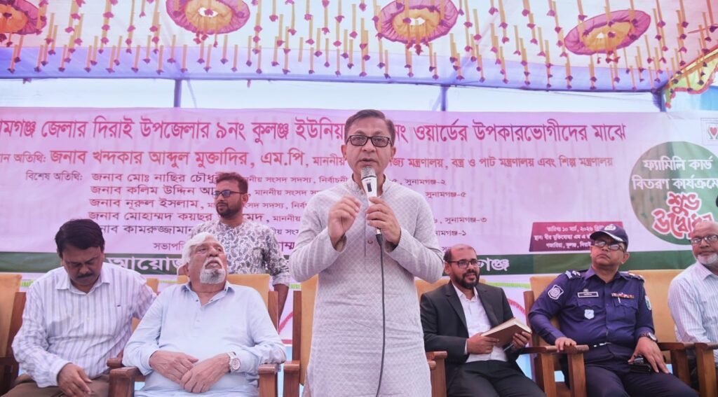 মন্ত্রী মঙ্গলবার (১০ মার্চ, ২০২৬) সুনামগঞ্জের দিরাই উপজেলার ৯ নম্বর কুলঞ্জ ইউনিয়নের ৬ নম্বর ওয়ার্ডে বীর মুক্তিযোদ্ধা এম. এ. রউফ জুনিয়র স্কুল প্রাঙ্গণে উপকারভোগীদের মাঝে ফ্যামিলি কার্ড বিতরণ অনুষ্ঠানে প্রধান অতিথির বক্তব্যে এসব কথা বলেন।
